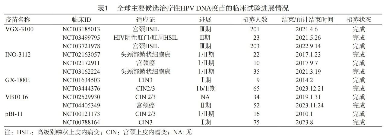 全球7种候选治疗性HPVDNA疫苗的临床试验进展情况: